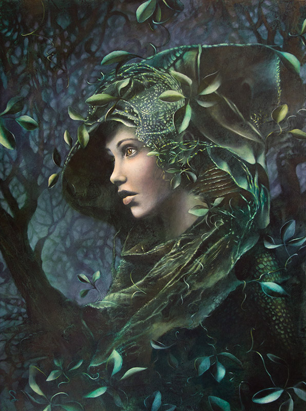Also was lag näher als eine Dryade zu malen, einen Baumgeist, eng mit seinem Baum verbunden, verwachsen, so dass man nicht weiß, wo der Naturgeist endet und die Pflanze anfängt.